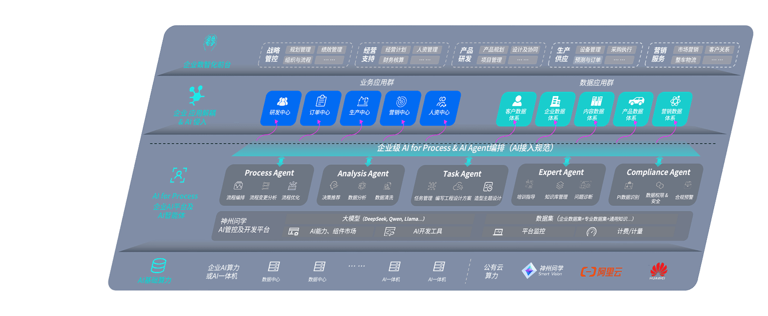 端到端的一站式AI工作空间深度融合了从企业战略规划到日常经营的全流程业务板块,,,,定向解决车企内部领域多、、、、部门多、、、链条长、、、场景碎片化等难题,,,支持车企快速构建以AI为核心的生产力写作体系,,,,实现任务执行与AI能力的无缝集成与交互