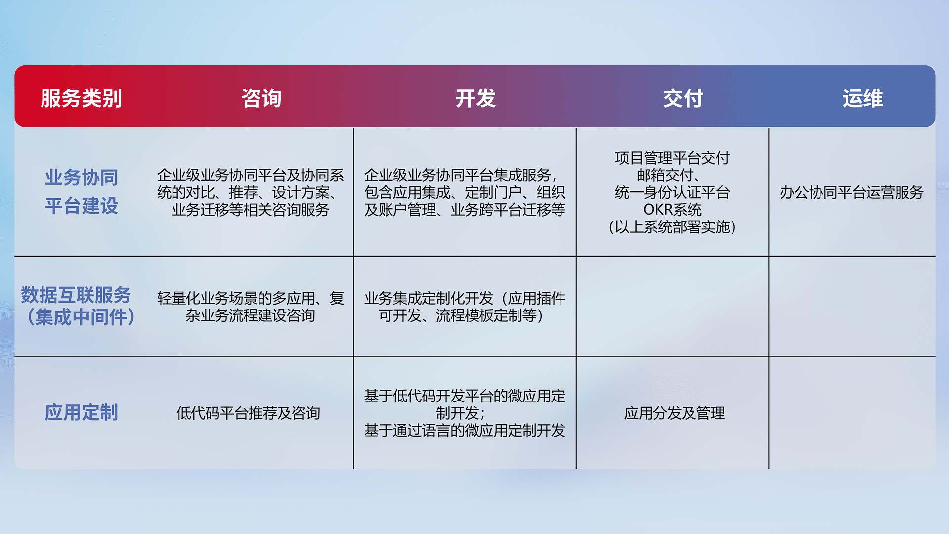 针对钉钉、、、、企微、、IDaas等平台级产品提供产品的规划、、、方案、、、交付、、、、定制化开发等服务,,,实现如统一协同办公、、、、智能客户服务、、、混合会议管理、、、、智能数据查询、、等业务场景,,,实现数字化转型。。
