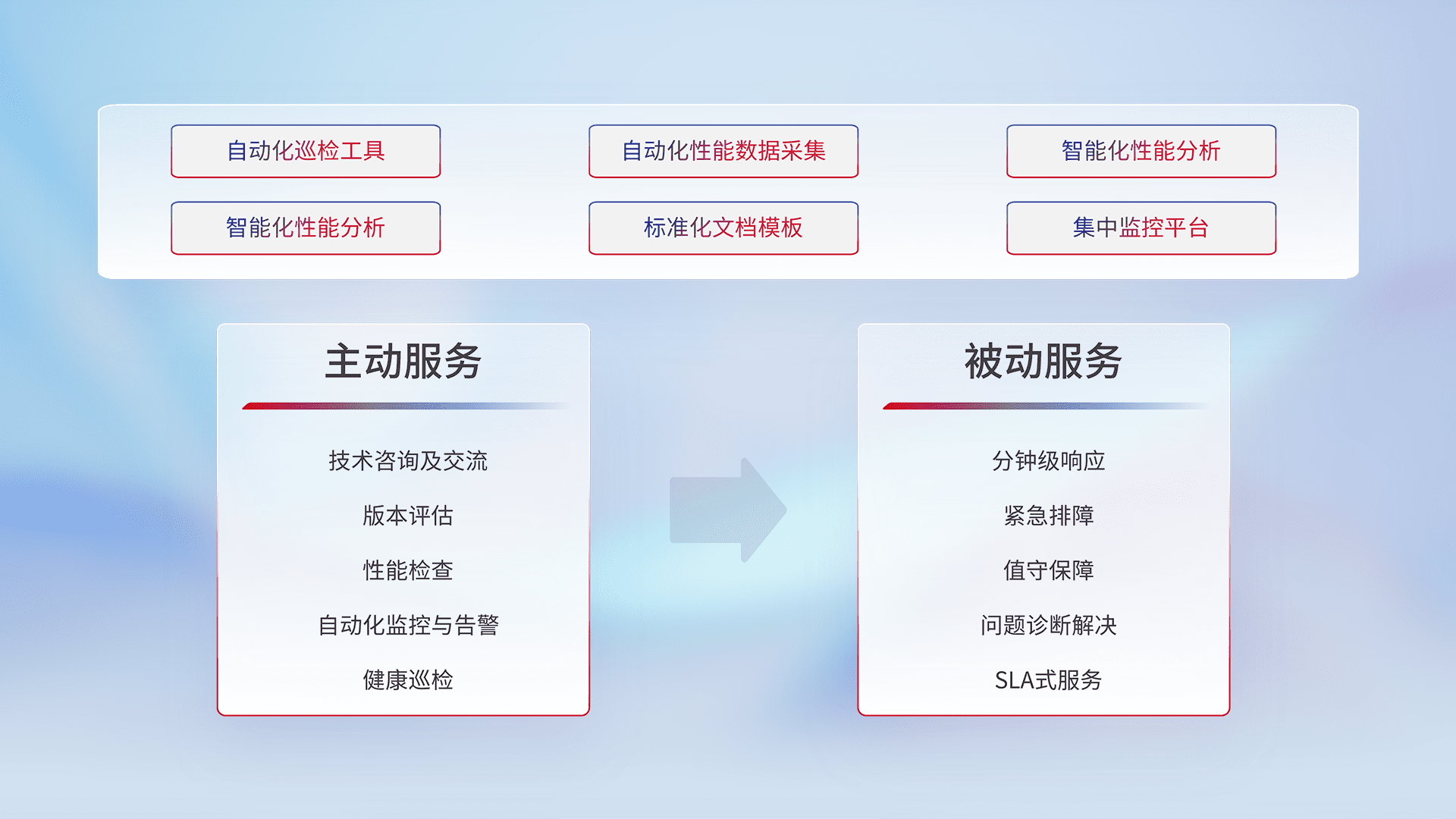 智能化工具和标准化文档,,,保障服务质量,,,,提供主动服务(包含技术咨询、、、版本评估、、、、性能检查、、、自动化监控与告警、、、健康巡检)和被动服务包含(分钟级响应、、、紧急排障、、值守保障、、问题诊断解决、、、、SLA服务)。。。